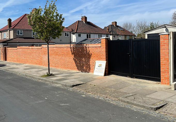 DOUBLE SKIMMED BRICK WALL. 22 METER LONG, 1.80 METER HIGH, FOUR PILLARS WITH PIER CAPS, ROWLOCK COURSE TO FINISH OFF THIS AMAZING WALL. IN ADDITION INSTALLTION OF HARROGATE ALUMINIUM DRIVEWAY GATES AND SIDE GATE. FULL PRIVACY VERTICAL SOLID INFILL, MODERN AND STREAMLINED DESIGN.
